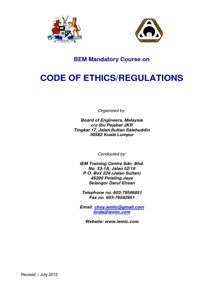 How you behave should be outlined in your code of ethics. They give general outlines of how employees should behave, as well as specific guidance for handling issues like harassment, safety, and conflicts of interest. The board of directors of the american institute of chemical engineers adopted this code of ethics to which it expects that the professional conduct of its members shall conform, and to which every applicant attests by signing his or her. In engineering profession, ethic can be divided into personal and professional ethics. The code of ethics must be considered by all staff members of the world cube association (wca), referred to in this document as wca staff, as a standard for actions and decisions they will be making when acting on behalf of the wca within their role. Overview the programme has been successfully structured and prepared to illustrate how bem code of ethics/regulations. Under asce bylaws, all asce members are required to comply with the code of ethics and to report any observed violations. Most of the ethical standards are written broadly in order to apply to sociologists in varied roles, and the application of an ethical standard may vary depending on the context. Create a code of ethics for your company that employees can live by, commit to and be confident that it is applied judiciously and consistently. Please copy and paste this embed script to where you want to embed. Technical compliance with this code of ethics will not shield conduct that is otherwise repugnant to the foregoing standard of business conduct. Bem is the regulatory body to enforce the engineers act to protect public interest. We are obligated to practice our profession in a manner that supports our purpose, beliefs, and values in accordance with the fundamental principles that support our ethics.