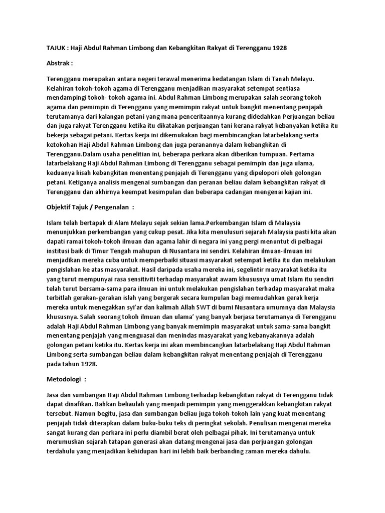 Haji abdul rahman limbong was known as someone who has stable economic. Nama sebenar haji abdul rahman limbong bin haji abdl hamid. B) pada tahun 1992, haji abdul rahman limbong bertindak sebagai peguam untuk membela peeteani di kuala telemong yang ditangkap kerana pihak british telah melancarkan serangan dan haji abdul rahman limbong telah ditangkap. Haji abdul rahman limbong dijatuhi hukuman buang negeri ke makkah atas tuduhan menghasut serta mencetuskan british menangkap 43 orang petani dan mendakwa mereka di mahkamah. From 1922 until 1928, he was a resistance leader seeking to resist laws and changes introduced by the british.
