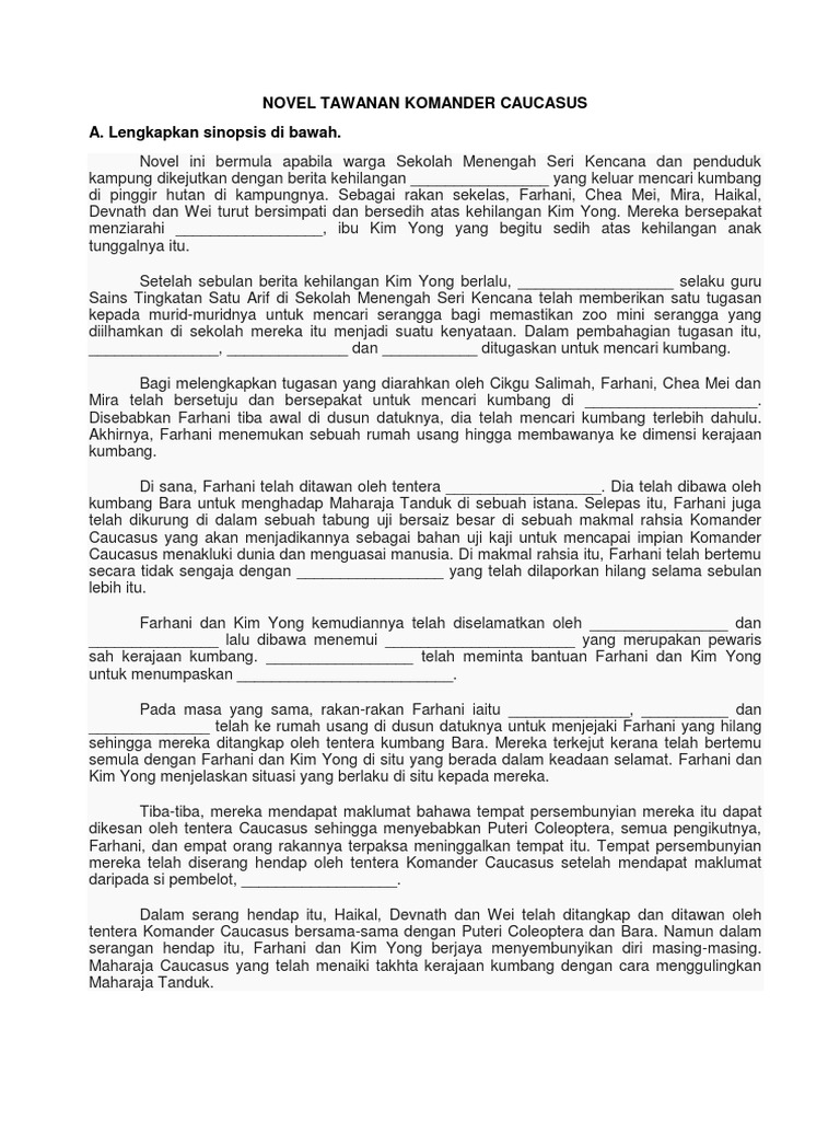 (tingkatan 3) novel tawanan komander caucasus.pdf (tingkatan 3) novel tawanan komander caucasus.pdf. Learn vocabulary, terms and more with flashcards dara bintik telah menukar ke penyokong tawanan komander caucasus kerana tidak ingin berlari. Sinopsis, tema, persoalan, nilai, pengajaran, gaya bahasa, plot, teknik plot, watak dan perwatakan, latar tempat, latar masa, latar masyarakat, soalan + jawapan : February 16, 2017 at 3:55 am ·. Episod 11 musuh menjadi sahabat #kd10hebat.